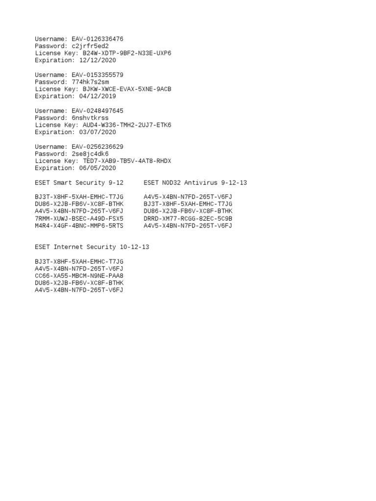 Nod32 9 & 8 Serial License Keys Username And Password Eset ... Nod32 9 & 8 Serial License Keys Username And Password Eset. Nod32 9 & 8 Serial License Keys Username and Password Eset Antivirus Ess Activation--SSEC - Download as Text File (.txt), PDF File (.pdf) or read online. 9.eset smart security 9 licence keykeysbot proeset nod32 antivirus 8username nod 32 9eset nod32 antivirus 11 license key 2020eset smart security 10 license key 2020