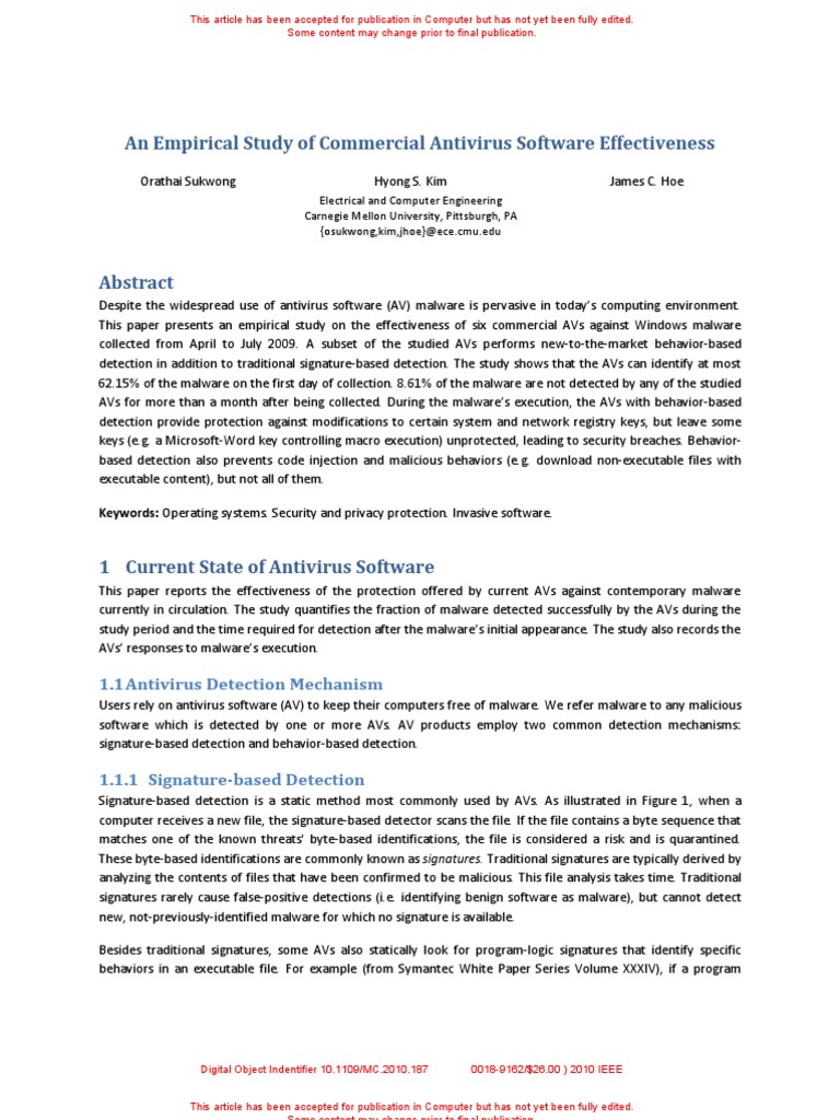 Commercial Antivirus Software Effectiveness: An Empirical ... by O Sukwong · 2011 · Cited by 104 — Despite the widespread use of antivirus software, malware remains pervasive. A new study compares the effectiveness of six commercial AV products. Commercial Antivirus Software Effectiveness: An Empirical Study | IEEE ... Commercial Antivirus Software Effectiveness: An Empirical Study Abstract: Despite the widespread use of antivirus software, malware remains pervasive. A new study compares the effectiveness of six commercial AV products.