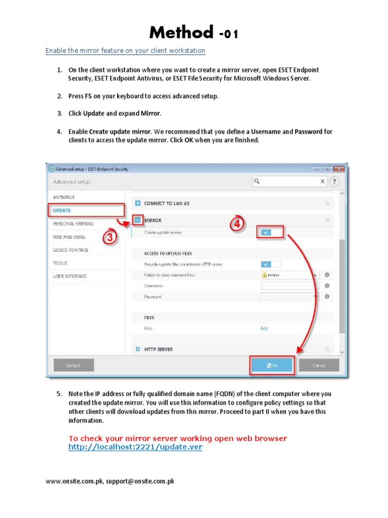 Updating from the Mirror | ESET Endpoint Antivirus | ESET Online Help 1.Open ESET Endpoint Antivirus Advanced setup and click Update > Profiles > Updates. 2. Disable Choose automatically next to Module updates and a new server to the Update server field using the \\UNC\PATH format. For updates to function properly, the path to the Mirror folder must be specified as a UNC path. Updates from mapped drives may not work.