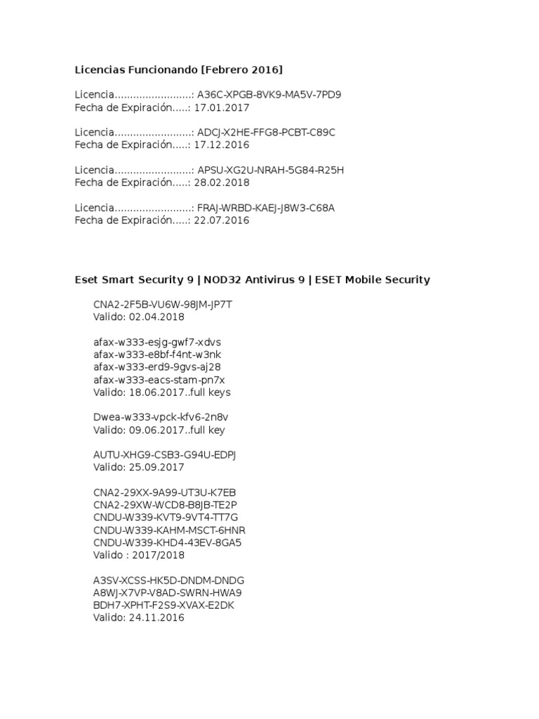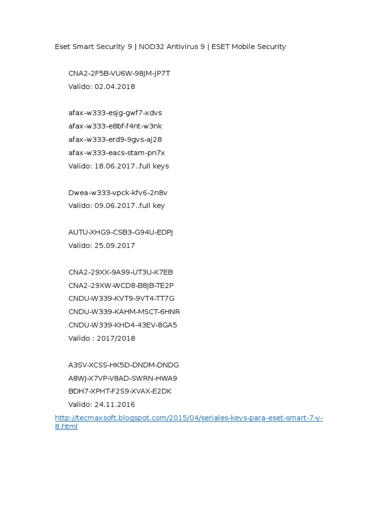 NOD32 Username and Password Keys Valid 20172018 For Eset Ess 10, 9, 8 ... NOD32 username and password keys valid 20172018 for eset ess 10 ,9 ,8 - SSEC.txt - Free download as Text File (.txt), PDF File (.pdf) or read online for free. Scribd is the world's largest social reading and publishing site.