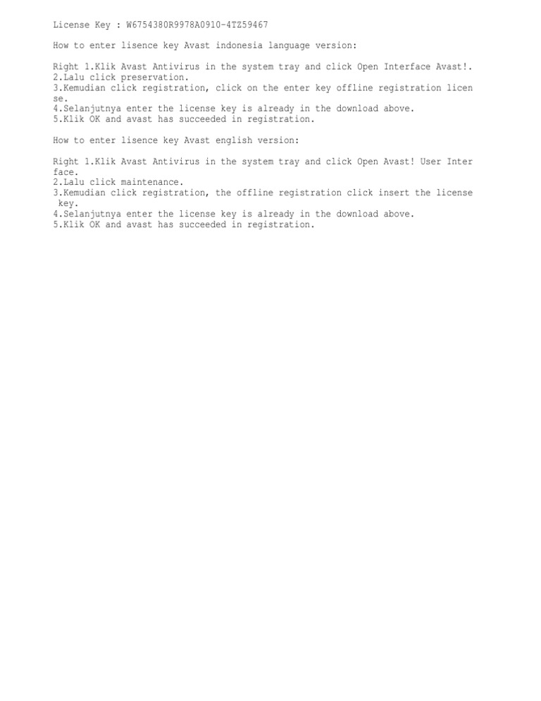 Avast antivirus with serial key free download. Avast Offline Installation Files | Avast The installation files for our award-winning antivirus and other Avast products. Install our award-winning antivirus software and join the world's largest security network. Browse privately from anywhere in the world, without being tracked. Automatically update, fix, clean, and boost your computer. Register Avast Free Antivirus If you're using Avast Free Antivirus version 7 or older, please use this universal key: W11332244H9900A0420-8MRTR8W5. Don't yet have Avast Free Antivirus? Avast Premier Security License Key 2023 & Activation Code Free Avast Premier Security License Keys (Updated – April 25, 2023) · UWRRJ-8LD3R-NCCFM-U5SCH-K5K3L-9CA7H (365 days) · NCTNQ-Z4XNS-2JF6L-QYV4U-HADGH-BWRV5 (365 days) ... Avast Premier Activation Code and License Key [2023] Go to the official website of the developer and download Avast Antivirus. Install it on your system. After installation, you need to locate the Avast icon on your desktop. (Note: if it's not there, click on the start menu and you'll find it there.) Run Avast Antivirus and go directly to the 'My licenses' option.