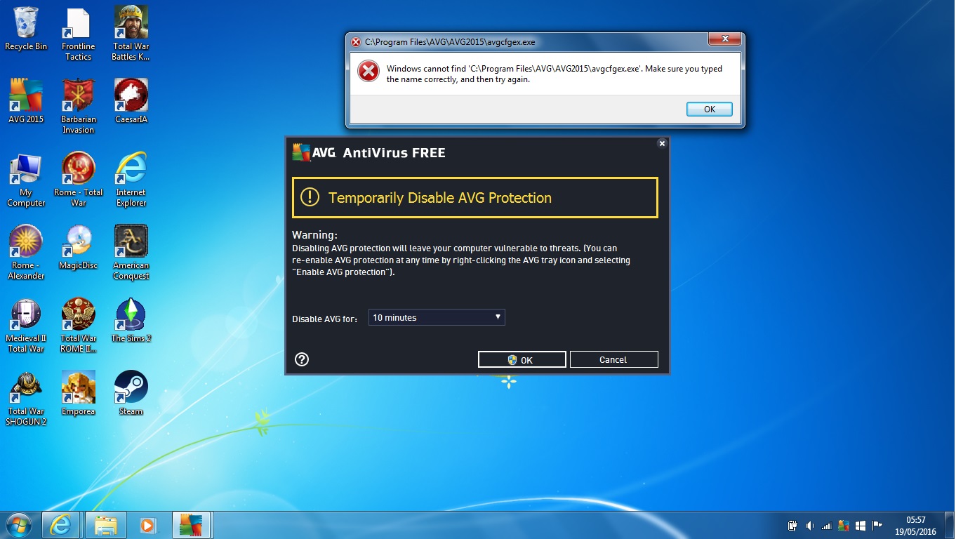 How to temporarily disable AVG Antivirus | AVG Disable all AVG protection. Right-click the AVG icon in the notification area of your Windows taskbar, then in the menu that appears, click the green slider next to Protection is ON.; Click OK, stop to confirm that you want to disable all AVG protection.; The slider turns red (OFF), and all AVG components are disabled. AVG protection will re-enable automatically the next time you reboot your PC. How do I turn it on my AVG? | AVG - AVG AntiVirus Go to Start -> Control Panel. Note: Click Settings first if Control Panel is not available in the Start menu. Open (Programs) -> Programs and Features, or Add or Remove Programs. Select AVG Protection in the list of programs. Click the Change or Change/Remove button. Select Repair.